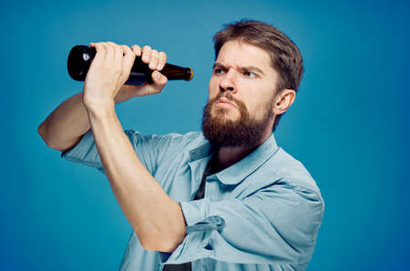 Man with a beard on a blue background holds a bottle of beer, portrait, alcohol.