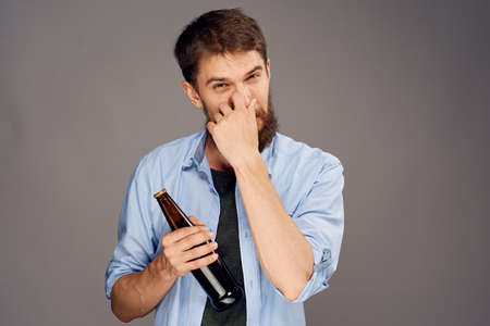 A man with a beard on a gray background holds a bottle of beer and picks his nose.