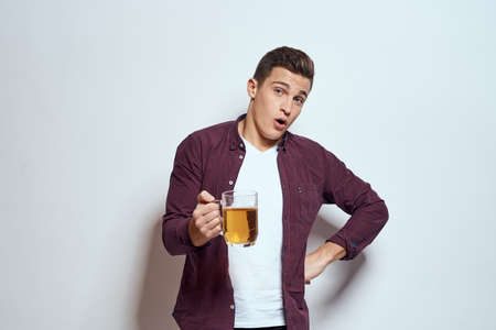 Drunk man with a mug of beer vacation alcohol lifestyle in a red shirt emotions light background