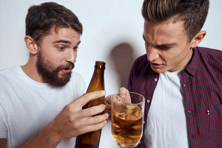 Two friends drink beer leisure fun alcohol friendship lifestyle light background
