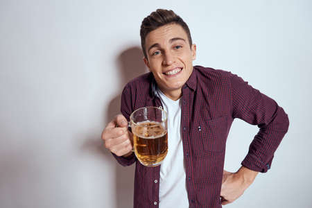 Cheerful man with mug of beer alcohol emotions light background