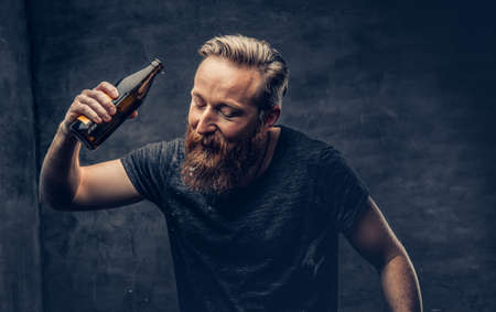Emotional, funny redhead bearded drunk hipster male holds craft bottled beer.
