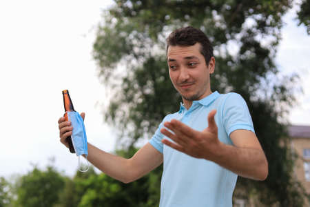 portrait of the handsome young man wearing a blue t-shirt, refusing the bottle of beer.
