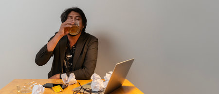 Asian businessman fails, man in despair drinks hard liquor, sitting late at the table in the office, depressed and hopeless. Concept of alcoholism in the workplace. Drunk man in the office.