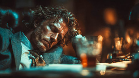 A man is resting his head on a bar counter after a night of partying. The background shows colorful lights. A glass sits nearby, indicating drinks were consumed.