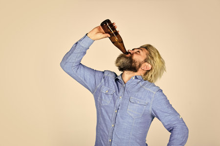 bringing Spirit of Life. relax after working day. lets have fun. bearded man has hangover. mature man drink beer. healthy water in glass bottle. hipster drinking alcohol beverage. beer and football
