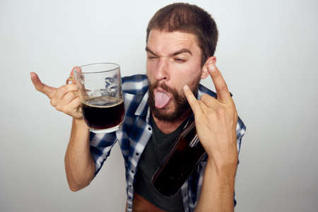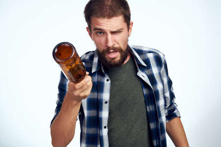 a man in a plaid shirt beer alcohol emotions fun light background