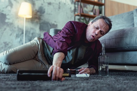 Bottle of vodka. Drunk alcohol addicted man reaching his hand after bottle of vodka while lying on the floor near cigarettes