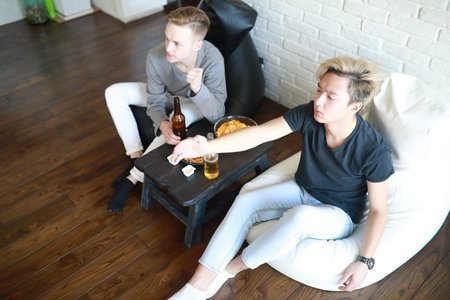 Group of young friends emotionally watching sports match on TV at home. Guys are holding glass beers in their hands. Friends support different teams