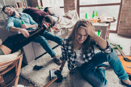 What we did last night? Bearded, upset, unhappy guy suffering from headache after night events, woke up on the floor holding hand on head, his drunk friends sleeping on couch on blurred background