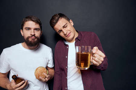 Two drunk friends drinking beer rest fun dark background