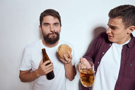 Two friends drink beer leisure fun alcohol friendship lifestyle light background