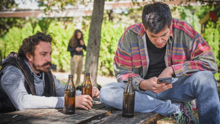 Young man drinks beer from bottle with his friends and look his mobile phone and sit on wooden bench with table in forest park outdoor. Real life scene