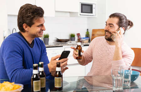 Friendly male meeting over beer at home, men looking at phone and discussing