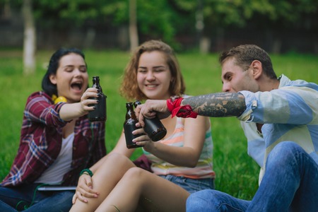 Joyful besties celebrate the occasion in a park. Students have a beer and rest after classes.