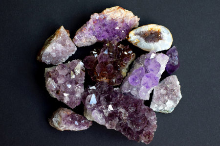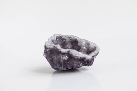 Close up photo mineralogy and esotericism. Purple quartz druse or geode mineral stone.