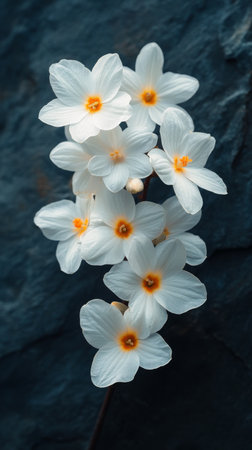 A cluster of delicate white flowers with bright yellow centers rests on a textured dark surface, highlighting the natural beauty and intricate details of the petals and textures.