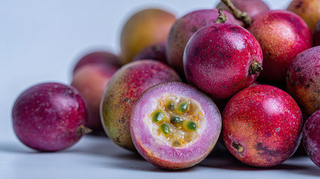 This image features a collection of passion fruits, with one cut open revealing the seeds. The fruits exhibit a range of colors from deep purple to yellow and green. The composition appears to be shot with soft lighting. This image could be suitable for use in promotional materials or educational content.