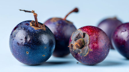 A stunning close-up image of fresh blue and purple fruits set against a light blue background, highlighting the vibrant colors and natural textures perfect for food styling.