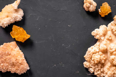 Macro shot of natural mineral gemstones on black stone background.