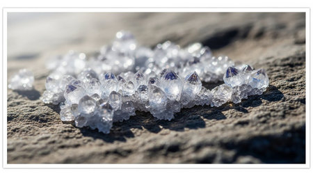 A cluster of clear ice crystals with sharp facets rests on a rough stone surface. Clear details and vibrant co...