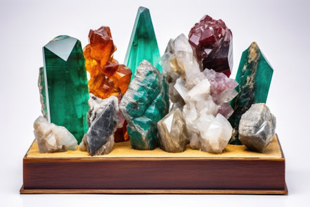 variety of rare minerals displayed in a rotating stand on a neutral background, created with generative ai