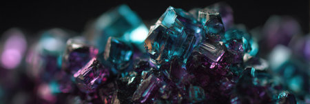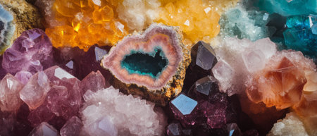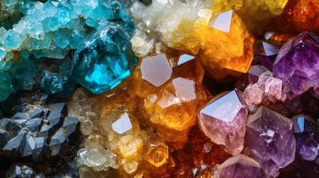 A close-up of colorful rock crystals and minerals, with vibrant hues and intricate details.