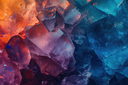 Close-up of vibrant, colorful, fractured crystalline quartz geodes or gemstone points