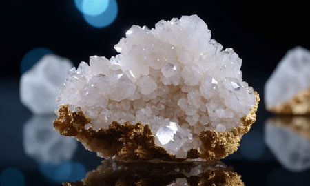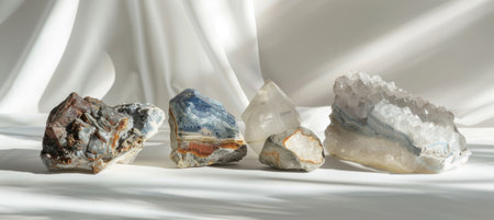 Polished rare earth mineral samples showcased on a glossy white surface, emitting an aura of luxury. soft shadows and pristine arrangement enhance the visual appeal, making it ideal for high-end design applications and product promotions.