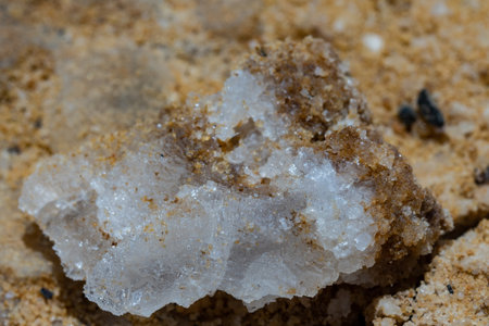 Close up of natural salt crystals, texture of salt and sand at the Dead Sea coast, Jordan.