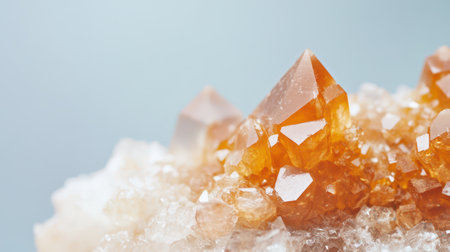 Close-up view of stunning crystalline formations with sharp edges. The contrast of white crystals against a textured orange rock creates a captivating visual.