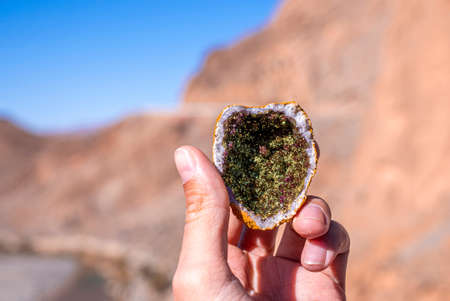 Person hand holding beautiful green amethyst cluster in sunlight