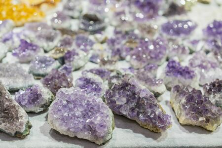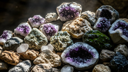 A stunning collection of amethyst geodes and various crystal minerals arranged together. The purple quartz crystals sparkle inside the rough rock cavities, showcasing the natural beauty of geological formations.