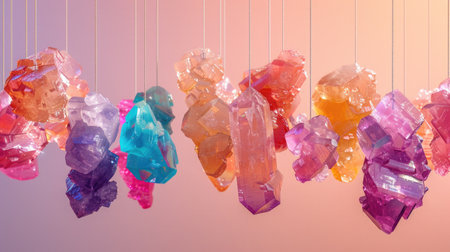 Colorful Crystals Suspended on Fine Strings Against a Soft Pastel Pink Background.