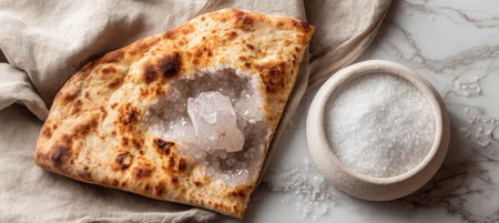 A warm flatbread bite sits on a burlap runner, its crumb revealing a crystal geode pattern, next to a rustic ceramic salt dish. The texture and detail make it feel like a homemade meal, simple and full of character.