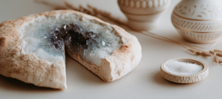 A warm flatbread bite reveals a delicate geode pattern inside the crumb, nestled beside a ceramic salt dish on a rustic burlap runner. Simple, earthy, and inviting.