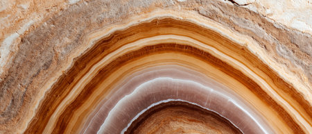 Detailed close-up of travertine slab with warm beige hues and natural concentric banding formed by sediment deposits over time.