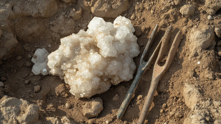 A striking crystal formation found in earth during an excavation illustrates the beauty of nature and geology, with tools highlighting the exploration process.