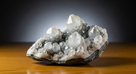 A stunning arrangement of quartz crystals emerges from a mineral base showcasing their clarity and intricate shapes against a neutral background.