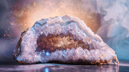 Amethyst geode with sparkling crystals, mystical ambiance and soft light