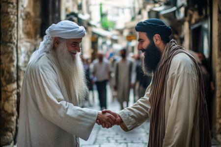multiethnic Muslim and Jewish people talking on city street