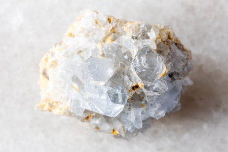 sample of rough celestine rock on white marble background close up