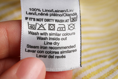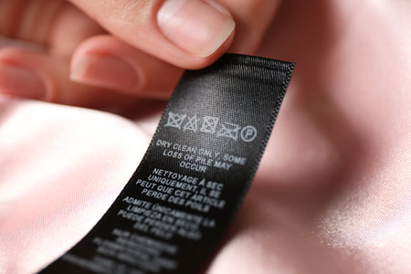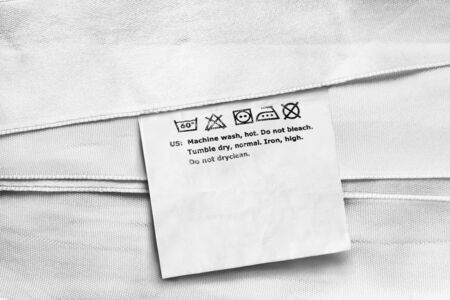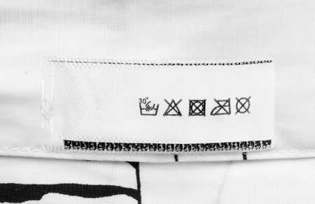 Washing instructions clothes label on white satin closeup