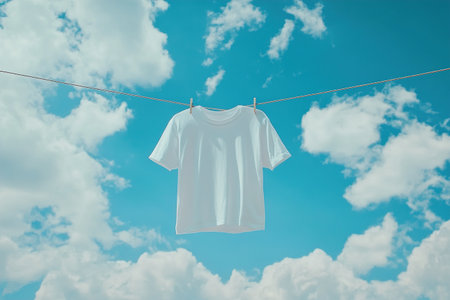 A delightful white shirt hangs on a clothesline, swaying softly in the wind. The vibrant blue sky and wispy clouds create a serene backdrop, evoking a sense of tranquility and freshness.