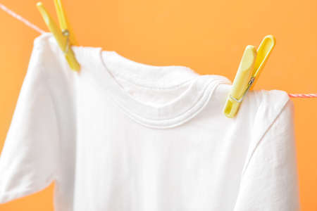 White t-shirt hanging on rope against color background, closeup