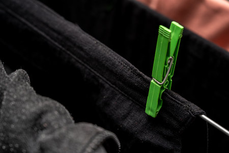 Laundry hanging with clothespins on a clothesline inside the house