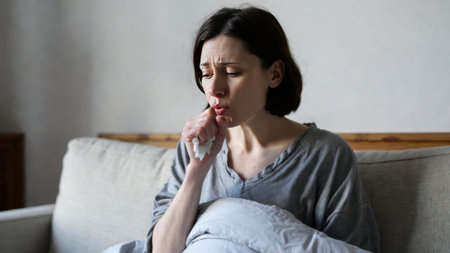 Asian Indonesian woman wearing a checkered shirt is coughing