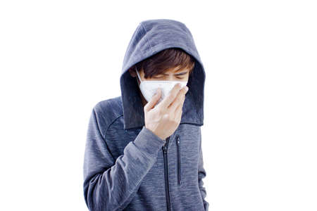 Portrait of a teenage boy in a medical mask, isolated on white background.