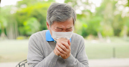 close up of asian elderly man wearing mask get a cold and cough outdoor in winter