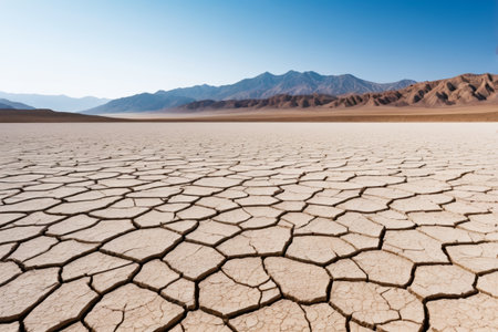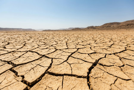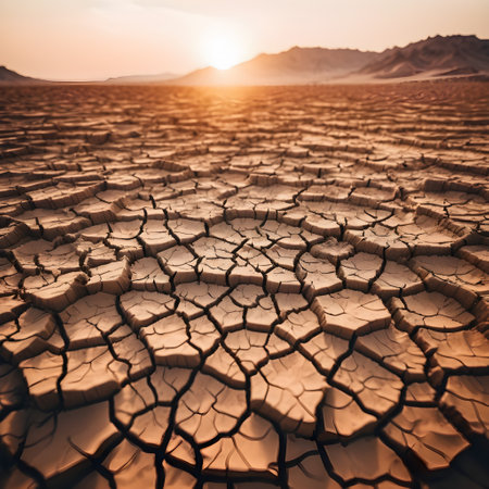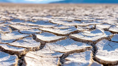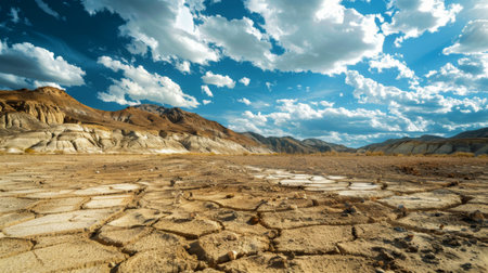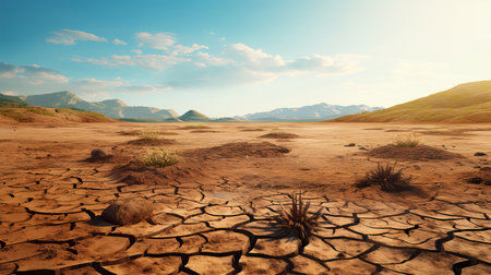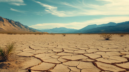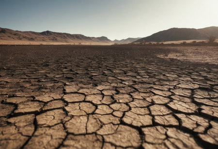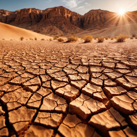 A striking image capturing a dry and cracked landscape under the bright sun with mountains in the distance, showcasing the effects of drought and environmental change.